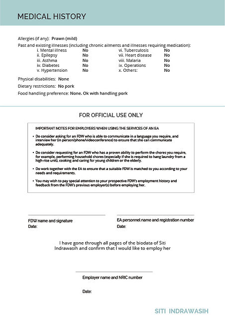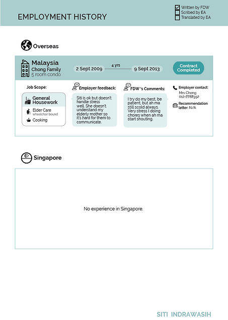 By humanising and personalising the information presented on the biodata, we aim to help employers understand FDWs as people, rather than commodities rated by statistics. In doing so, employers can get a glimpse of the FDW's personality and make a more informed judgment as to who will better match their caregiving needs.